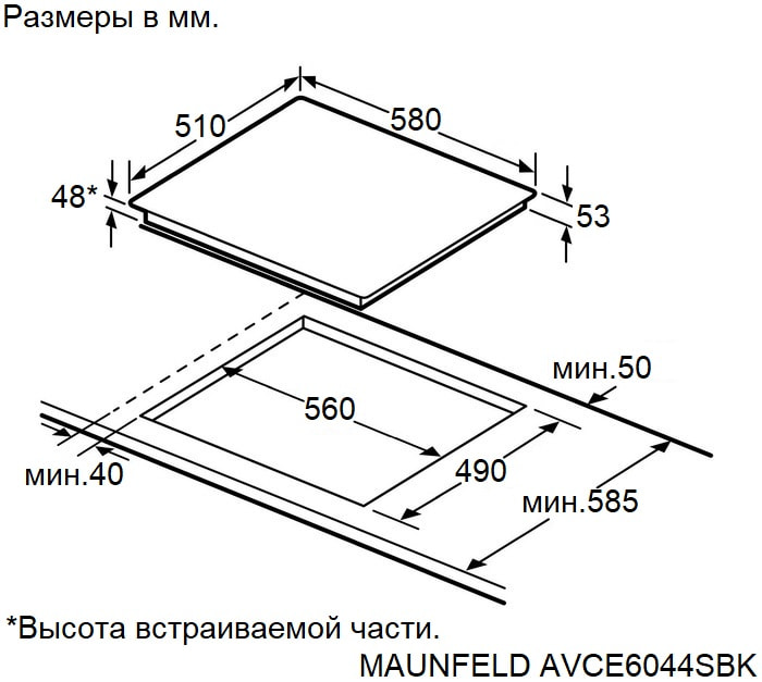 Ширина 58 см, глубина 51 см, высота 5,3 см – панель подходит для стандартной столешницы и идеально вписывается как в просторные, так и в компактные кухни.