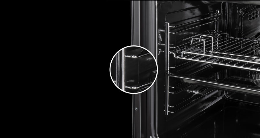 Объем 60 л при стандартной ширине духового шкафа 60 см позволяет готовить одновременно несколько блюд, разместив решетку или противень на одном из 5-ти уровней боковых направляющих. Один уровень оснащен удобными телескопическими направляющими. Внутреннее покрытие камеры выполнено из специальной легкоочищающейся эмали черного цвета.