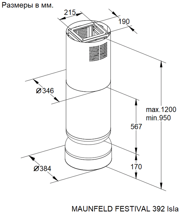 Конструкция: Телескопическая труба позволяет регулировать высоту от 950 до 1200 мм. Подключение к воздуховоду Ø150 мм. Возможна работа в режиме рециркуляции с установкой угольного фильтра.