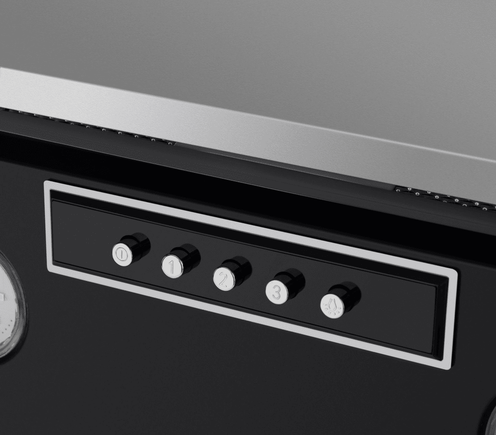 Наклонная вытяжка шириной 50 см. Корпус выполнен из нержавеющей стали. Откидная панель со вставкой из закаленного черного стекла.
