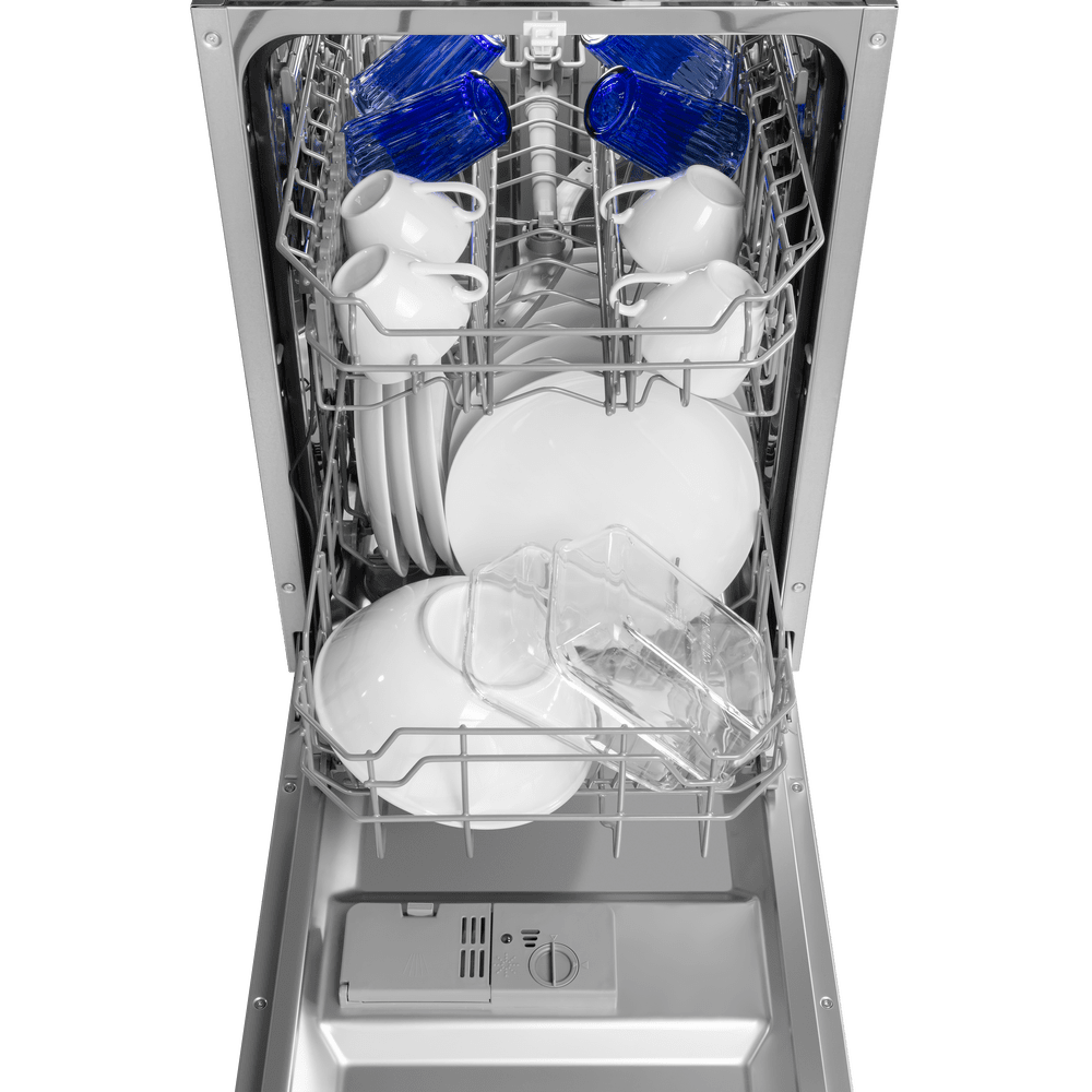Электронное управление с дисплеем расположено в торце загрузочной дверцы. Функционал данной модели позволяет вам выбрать программу мойки, включить половинную загрузку, выставить время отсрочки старта (1-24 часов).